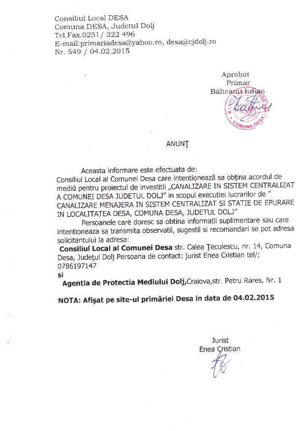 » Anunt - Investitie Canalizare in Sistem Centralizat a Comunei Desa, judetul Dolj